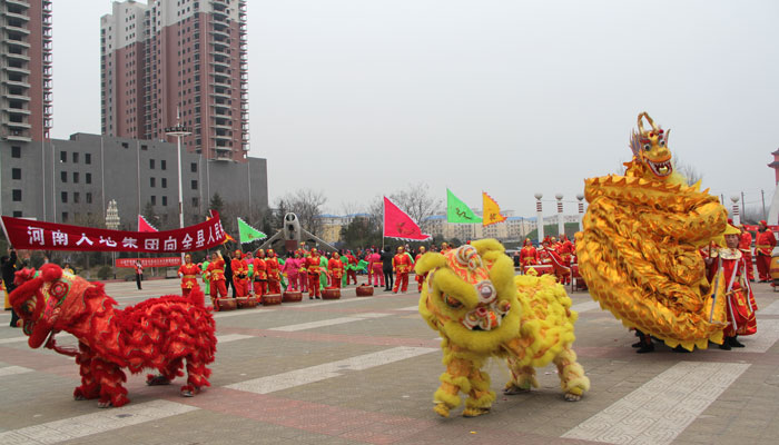 演出当天,春寒料峭,县城新世纪广场人头攒动、激情飞扬。在新世纪广场世纪柱北侧,乐虎向全县人民问好巨大红色条幅格外引人注目。表演现场,龙腾狮舞,锣鼓喧天,巨龙摇头摆尾,双狮追逐嬉戏,盘鼓高亢有力,观众将演出现场围拢得水泄不通,一个个拿出手机拍照录像…… 最后,由双狮引路,巨龙表演进入公司中控楼向大地公司拜年祈福、期盼羊年大吉! ![]() ![]()