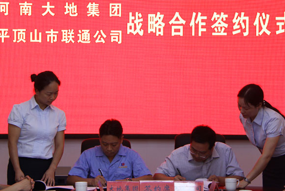 双方代表签约 集团总裁王国杰、平顶山市联通公司党委委员、副总经理谢记科分别代表合作双方在战略合作协议书上签字。 签约仪式在庄重、融洽、热烈的气氛中结束。随后,在张彪董事长的陪同下,朱练忠一行先后参观了大地公司中控室和贾湖酒业集团。