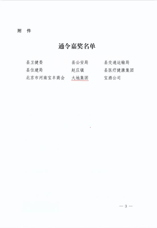 日前,县政府专门下发嘉奖令,对全县疫情防控工作中涌现出的先进单位予以表彰,乐虎因工作成绩突出、贡献重大,受到县政府的通令嘉奖。 面对突如其来的新冠肺炎疫情,大地集团迅速行动,坚决把职工的身体健康和生命安全放在首位。在不折不扣地执行省、市、县新冠肺炎疫情防控命令的同时,结合自身实际,周密部署,狠抓落实。第一时间成立了新冠肺炎疫情联防联控工作领导小组,制定了详细的《疫情防控方案》和《疫情应急预案》。集团各部门、各公司认真落实各项防控措施,步调一致、严防坚守,疫情防控和复工复产工作均紧张有序地进行。 大地集团始终弘扬公益精神,积极承担社会责任。新冠肺炎疫情发生以来,大地集团高度关注,在做好自身防控工作的同时, 2月1日下午,集团向河南省慈善总会捐助现金1000万元人民币,用于平顶山市和宝丰县疫情防控工作,为打赢这次疫情防控攻坚战贡献一份力量。