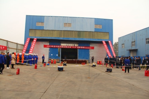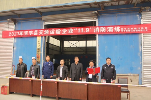 为贯彻落实“11.9”消防宣传月活动,11月4日上午,宝丰通达公司紧紧围绕“落实消防责任、防范安全风险”主题组织开展冬季消防应急演练,县交通运输局党组成员、副局长刘亚伟、县“三网"办消防大队副主任王拥超等领导到会指导,集团副总裁兼大地公司总经理赵中要、宝丰县通达运输公司总经理魏建敏等领导及县交警大队、交通运输局、全县道路运输企业代表现场观摩。