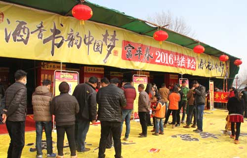 农历正月十一,笔者来到书会现场,伴随着一路“酒香书韵中国梦”的大型彩虹门,远远地看到道路两侧挂满了大红的灯笼。“天地同书马街会,日月共醉富平春;无酒不诗书,诗酒趁年华”等大红条幅格外引人注目,这是大地集团旗下的富平春酒业给今年的马街书会带来的新生机新活力。