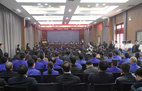 会议现场气氛热烈 一、大地公司要狠抓管理,勇于创新,充分发挥龙头骨干作用,实现优质高产、节能降耗、环保安全新突破,打造建材行业标杆企业;二、贾湖酒业集团要以抓管理,促销售,树品牌,增效益为中心,加大品牌建设与推广,加大科研投入与开发。做好贾湖文化的传承、弘扬和创新,打造百年酒文化品牌。以市场占有率为导向,实现销售新突破。力争把贾湖酒业集团打造成为国内知名的白酒生产企业;三、森佳公司许昌分公司要优化配比配方,千方百计提高台时产量,要创新机制体制,激活创造动力;四、大地建材公司和巨坤建材公司新年要有新思路、新办法、新突破,下大力气占领市场,提高销量,确保年度任务目标顺利完成;五、郑州领创置业公司要抓住房地产政策放宽的势头,做到快建设、快销售,尽早产生效益,打造高品质首期地产标志,为集团在郑州打造地产品牌打好基础。大地社区要加快建设,力争2016年底达到首期入住条件;六、下大力气狠抓主业销售工作,利用国家拉动经济、刺激经济的有利政策和机遇,抓大项目,抓大工程。努力发展新户,产生新量;七、进一步加强企业管理,落实好各项规章制度,提升企业管理水平和执行能力。新的一年要实现管理能力和质量的新提升;八、加大环保科研投入,着力推进回转窑分级燃烧和低氮燃烧环保新技术,进一步考察论证干法水泥生产线协同处置生活垃圾项目,努力打造省内首条环保节能示范生产线;九、坚持人才强企战略不动摇。制订中长期人才供需规划,建立人才数据库。强化员工学习培训,为企业快速发展提供人才保障。十、加强企业文化建设,提升企业文化内涵,进一步做好《大地集团报》的编印发放工作,充分利用网站和微信平台,大力推介品牌,进一步扩大“大地水泥”和“贾湖”“富平春”“领创”品牌的影响力和辐射力。