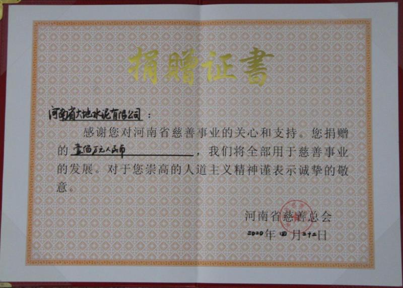 LEHU(游戏)官方网站 >> 走进大地 >>资质荣誉 >> 河南省大地水泥有限公司向河南省慈善总会捐款100万元